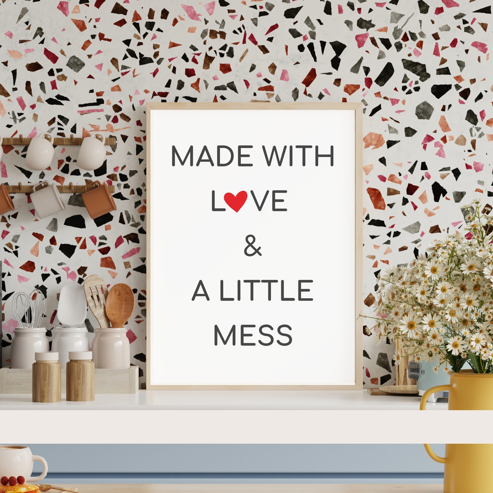 "MADE WITH LOVE & A LITTLE MESS" - A delightfully honest kitchen quote that celebrates the beautiful chaos of home cooking and family life.